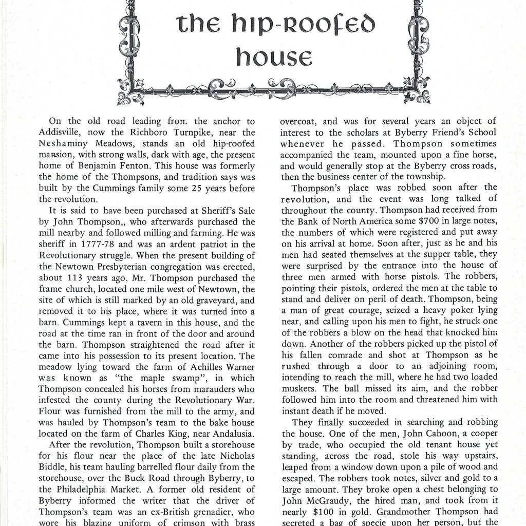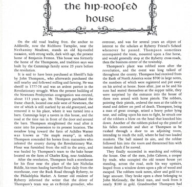 This historic home was built around 1740, and purchased in the 1750s by John Thompson, an American patriot during the Revolutionary War. The home is located on Second Street Pike (Rte. 232), just north of Richboro, near Chain Bridge, Northampton Township PA. Often described as the Hip Roof House, the house is actually an elongated gambrel roof design. The home is on the National Register of Historic Properties.
