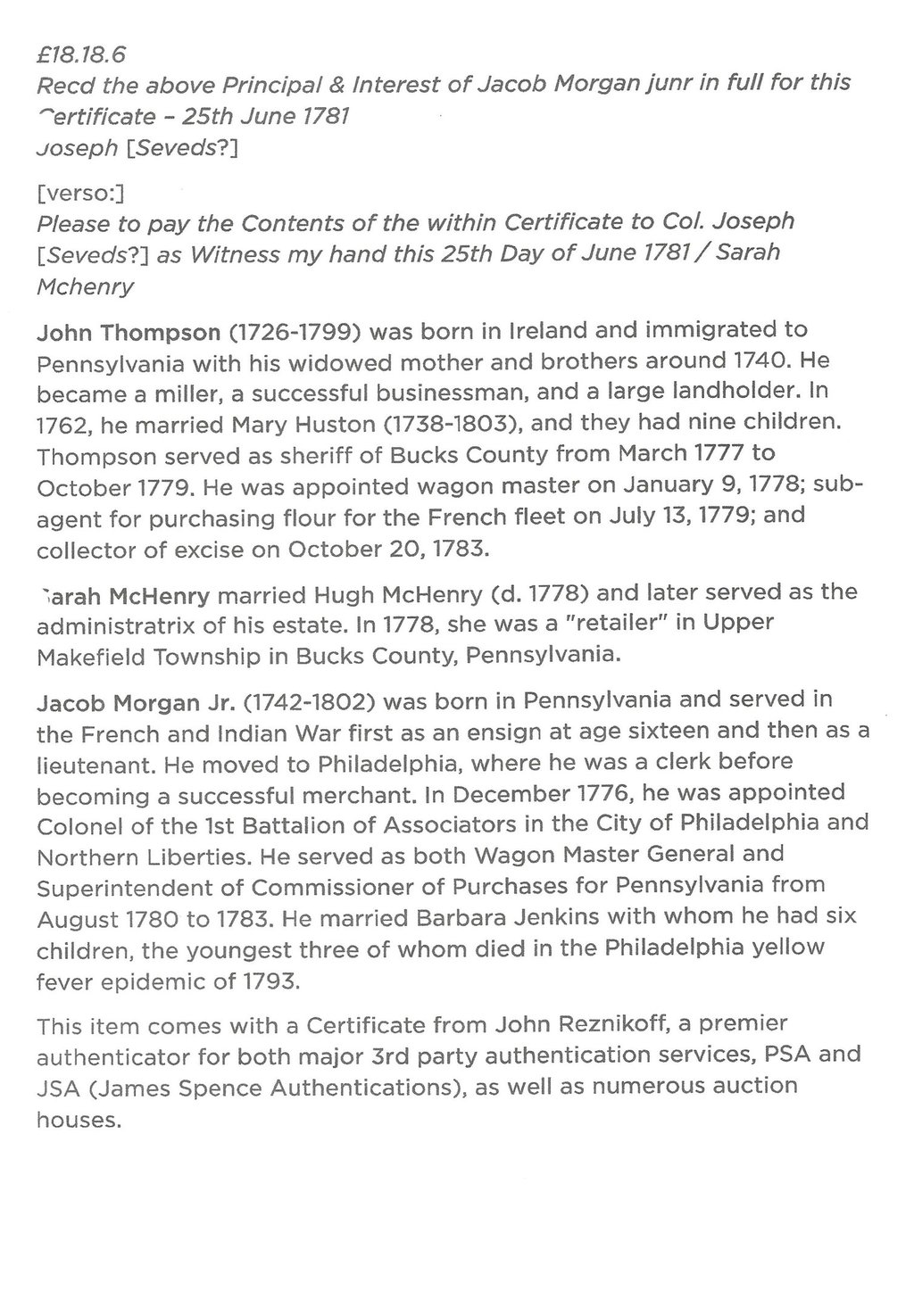 The following is a copy of an original receipt (and supporting documentation) from Wagon Master John Thompson for a purchase of a horse for Washington’s Continental Army in August 17, 1780 from Sarah McHenry of Hilltown Township, Bucks County. The Wilson-Thompson Family Association possesses at least one additional such receipt for another horse purchase issued by Thompson. It is housed in the Research Center of the Newtown Historic Association in Newtown PA. We suspect there were many more.