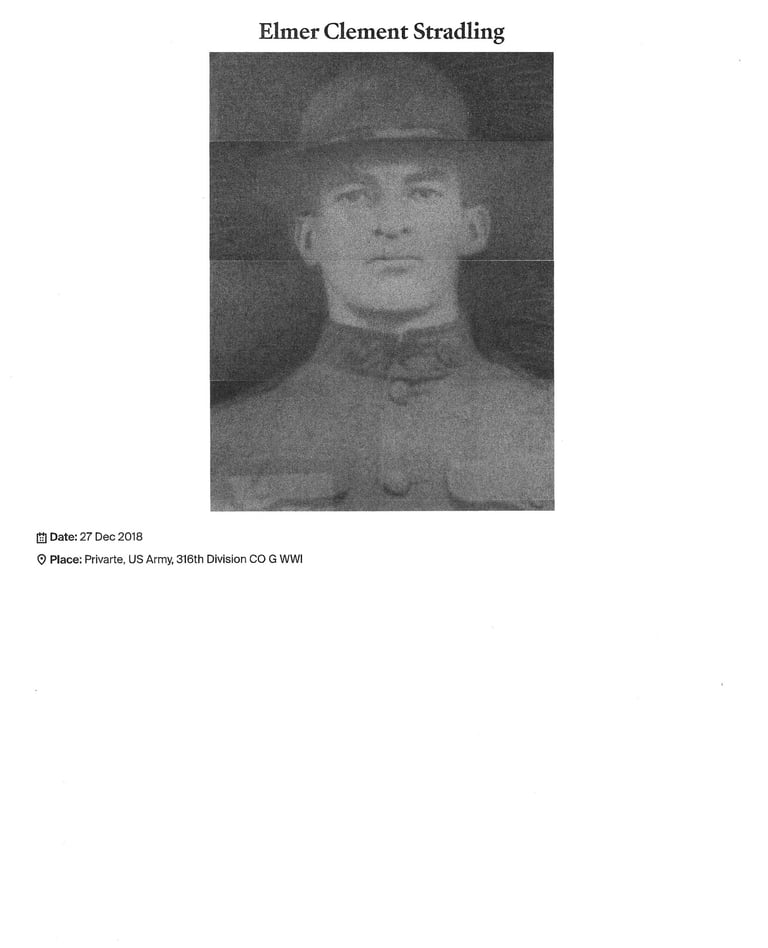 Elmer Clement Stradling, son of Russell and Mary Stradling of Brownsburg Bucks County, died October 20, 1918 in Argonne France during the Battle of Argonne during WW I. Private Stradling enlisted May 29, 1918. He was with the 316th Division, Company C of the US Army. He was 26 at the time of his death and is buried at Thompson Memorial Presbyterian Church cemetery. Stradling was older brother to Audrey Knowles Stradling Thompson.