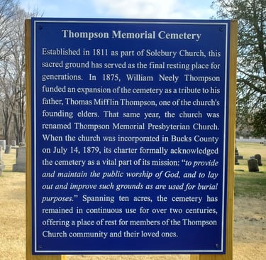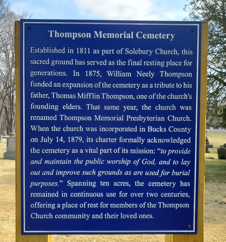 In 1822, when the First Presbyterian Church of Lambertville, NJ was organized, the Solebury Church sent some of her members to strengthen the new congregation. Ministers serving Solebury also rendered pastoral assistance to growing Presbyterian concentrations in Forest Grove, as well as Lambertville. The Thompson Memorial Presbyterian Church (Solebury Church) church cemetery dates back to the founding of the church and the original 2 acres of land. Tombstone inscriptions have been found dating to 1814.